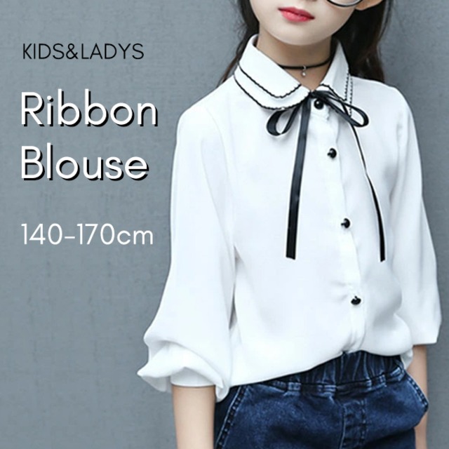 【リボン付き ブラウス】フォーマル レディース ガールズ キッズ トップス リボン 襟 長袖 ガールズ 白 リボン 定番 韓国 子供服 二重襟 丸ボタン 花ボタン