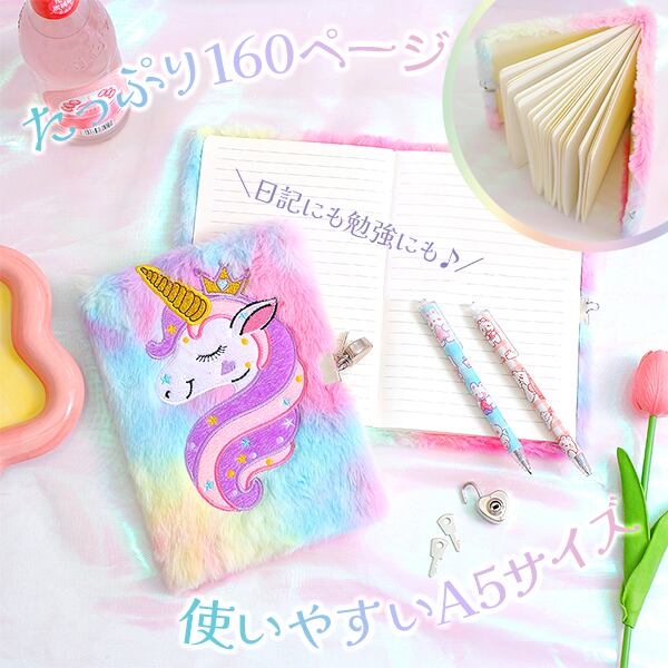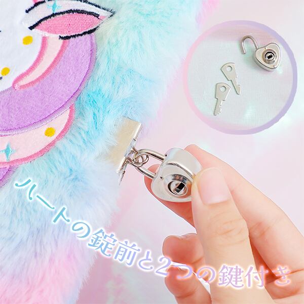 【ユニコーン 鍵付きノート】 A5 ファー レインボー ゆめかわ ふわふわ 160ページ 罫線ノート ロック付きノート 鍵付き日記 ダイヤリー 交換日記 ハートの鍵 ネコポス送料無料
